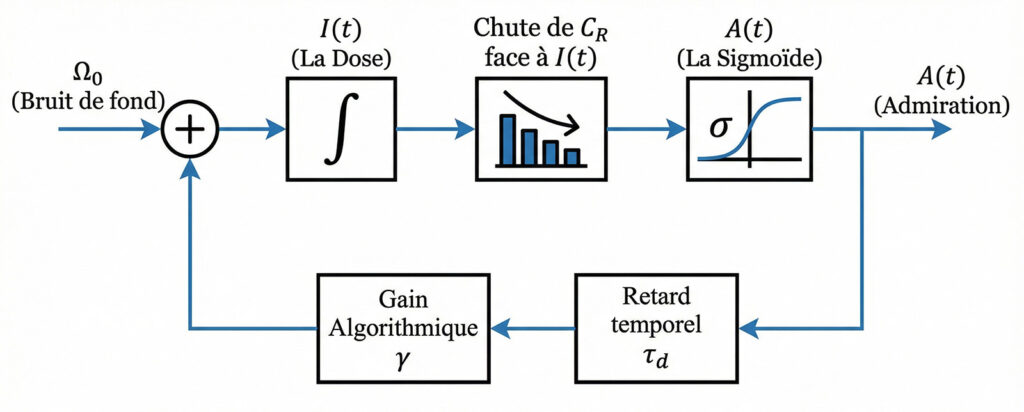 D’un point de vue de la dynamique des systèmes, il s’agit d’un « intégrateur à fuite » (leaky integrator). Le verdict de cette équation est d’une grande cruauté clinique : la dose accumulée ne peut espérer se stabiliser que si la purge ancrée dans le réel () parvient à contrebalancer parfaitement l’injection algorithmique continue (). Si le sujet s’isole physiquement et que tend vers zéro, l’intégrale explose, précipitant inévitablement la capacité de réflexion vers la faillite totale.